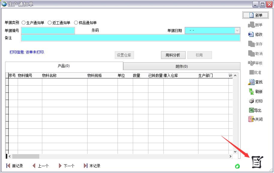 生產通知單列表打開路徑:【主菜單】->【計劃】->【生產通知單】->點右下角