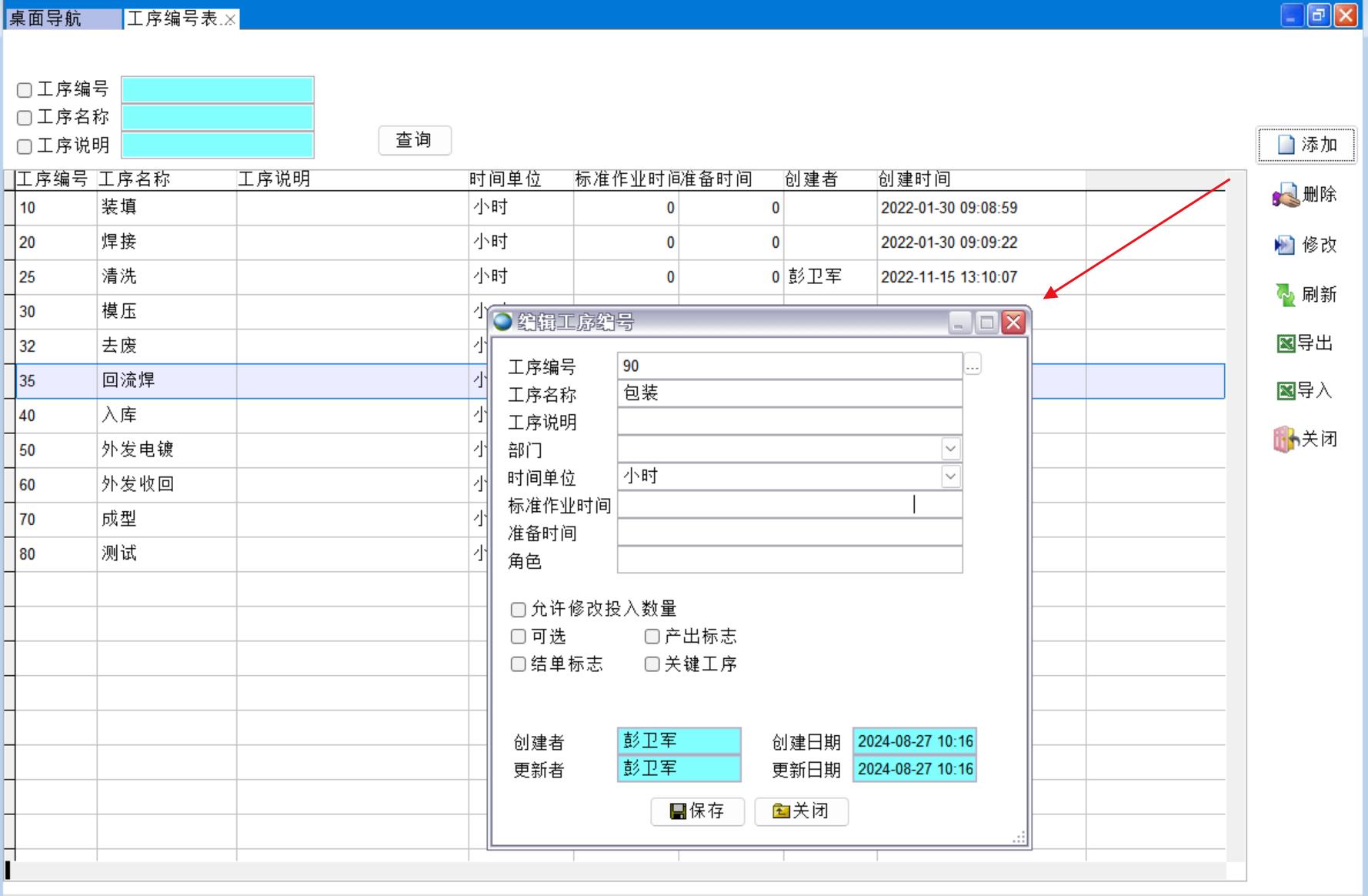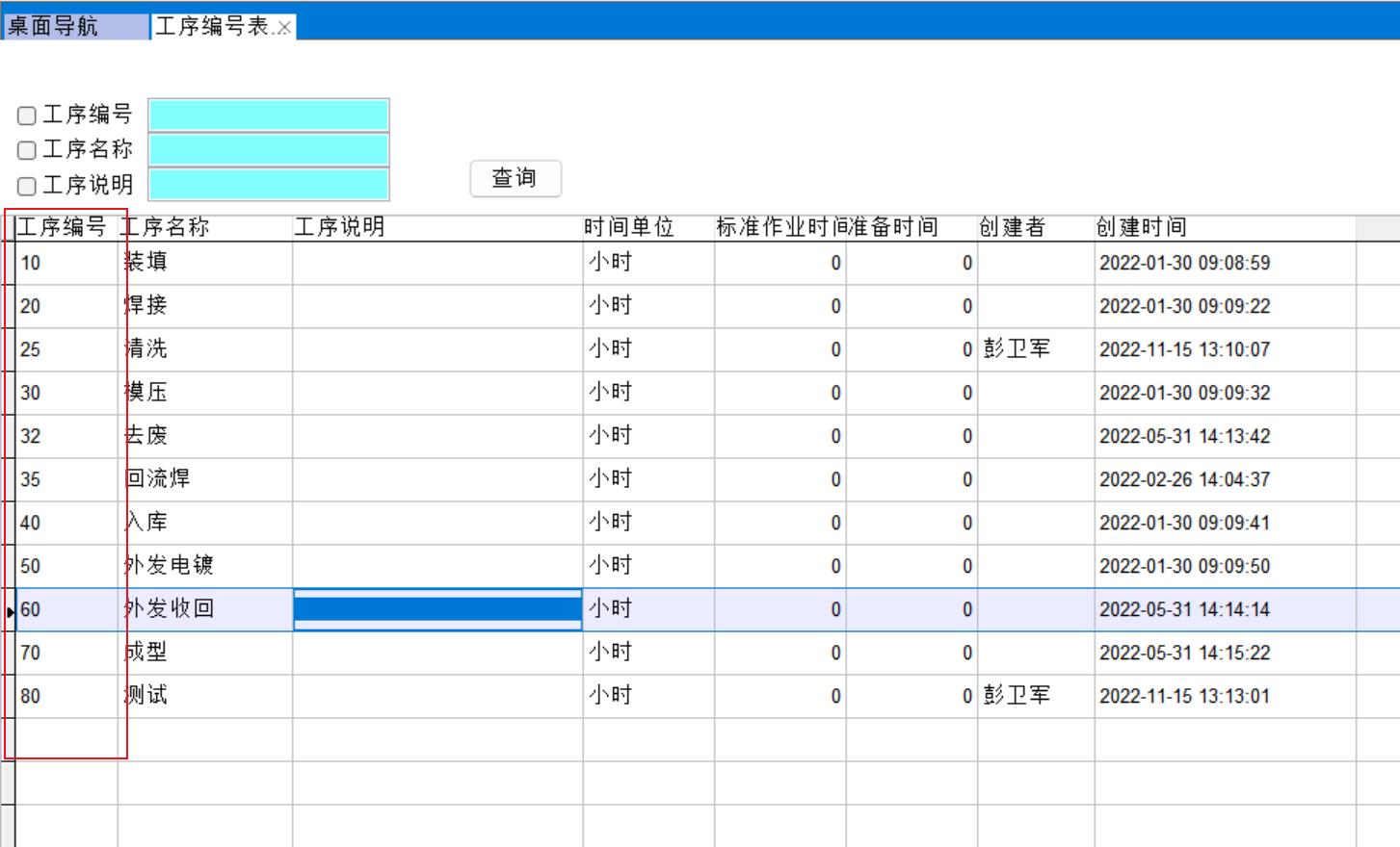 比如清洗工序是后加的,是在焊接之后的工序,就編號為25,保存后自動排到焊接后面。系統是按工序編號進行排序的,所以工序順序必須按數字大小進行編號,否則后面使用過程中會出現問題。