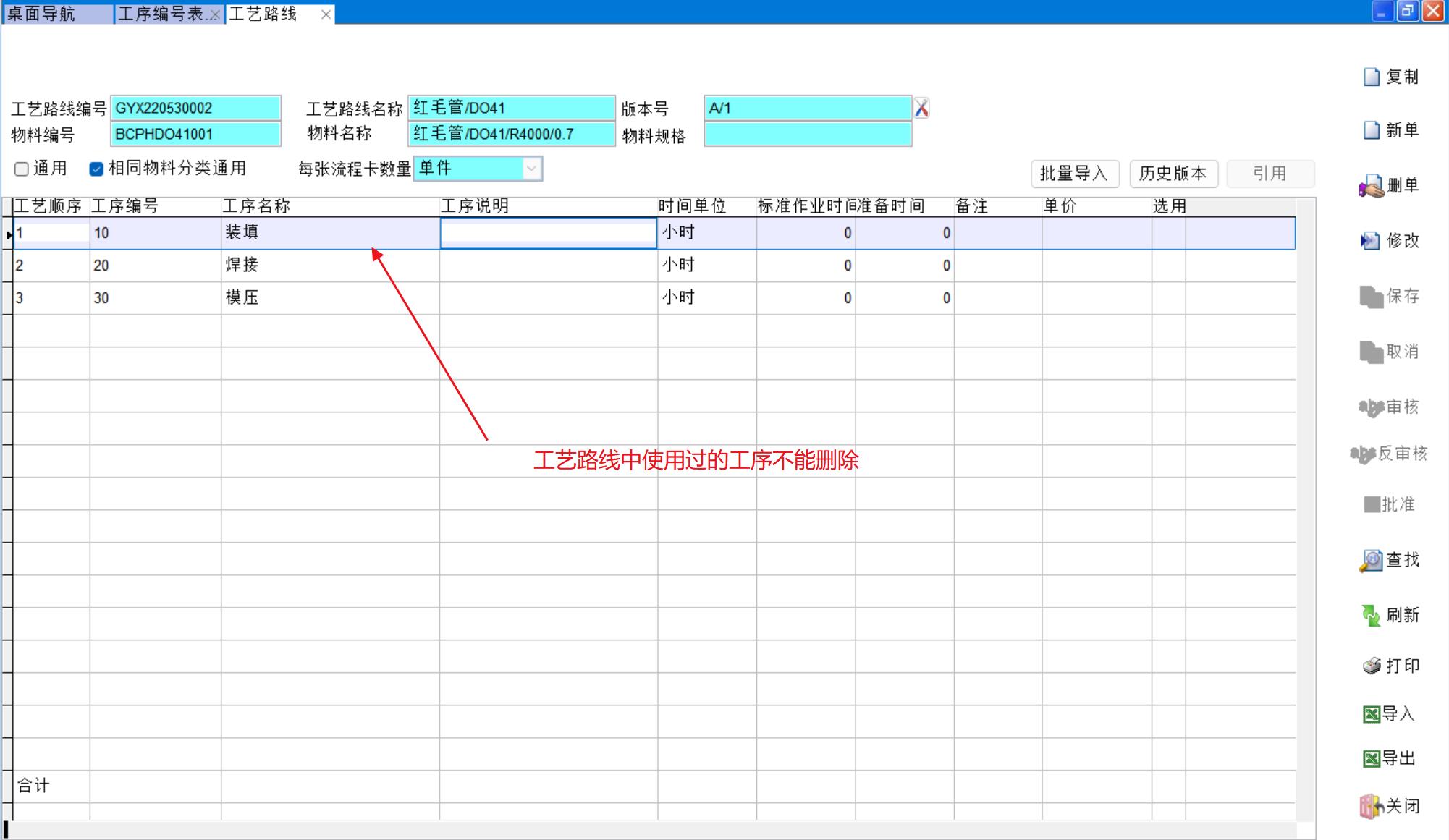 如果工序沒有被工藝路線使用過可以直接刪除,否則先刪除使用該工序的工藝路線再刪除此工序