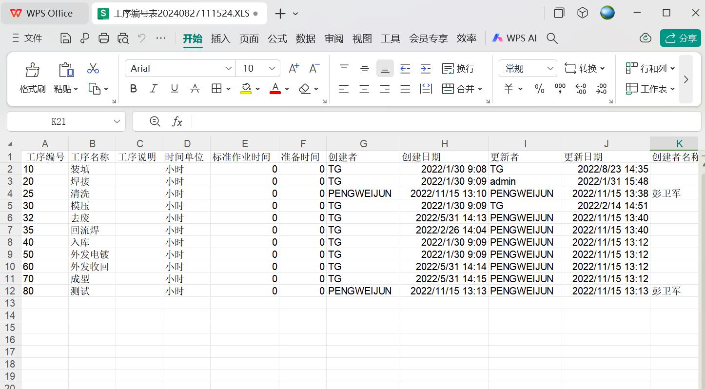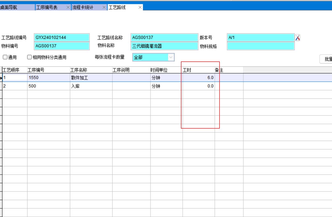 可以在工序編號表中輸入標準作業時間,也可以在工藝路線中輸入,在工序編號表中輸入會影響所有工藝路線,即這個標準工時對所有產品都一樣。