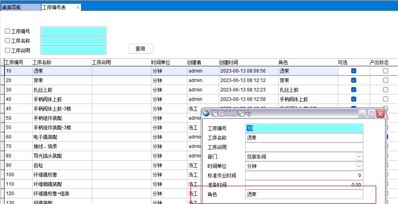 比如張三、李四負責燙束工序,王五負責穿束工序,設置兩個角色燙束、穿束,分別綁定這兩個工序