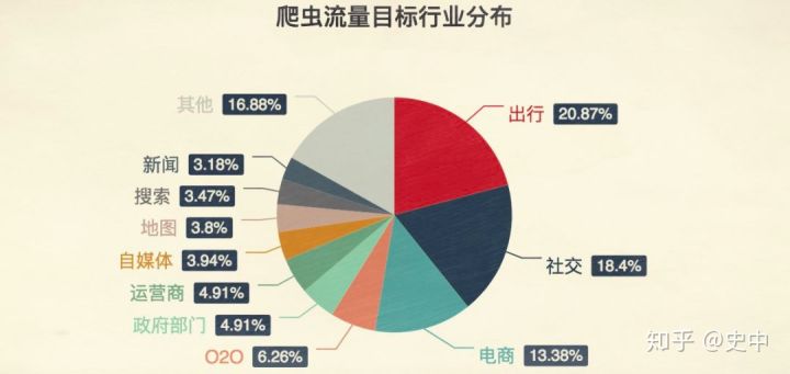 這張圖里顯示的,就是各行各業被爬“叨擾”的比例。(注意,這張圖顯示是全世界,不是全中國。)而每一個色塊背后,都是一條真實而強大的利益鏈條。接下來,中哥就給你科普一下里面的騷操作。1、排名第一的是出行出行行業中爬蟲的占比最高(20.87%)。在出行的爬蟲中,有89.02%的流量都是沖著 12306 去的。這不意外,全中國賣火車票的獨此一家別無分號。你還記得當年12306 上線王珞丹和白百何的“史上最坑圖片驗證碼”么?