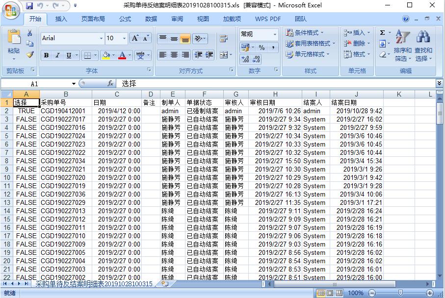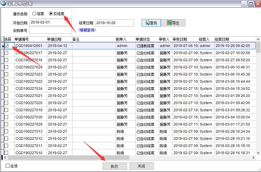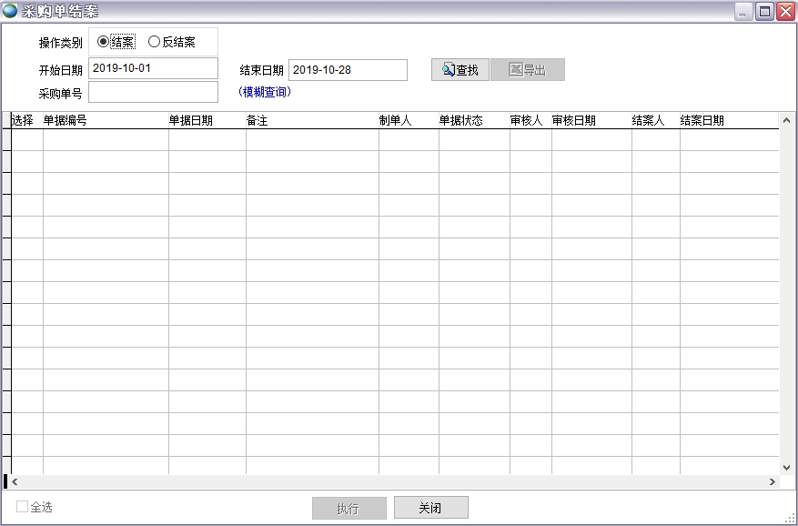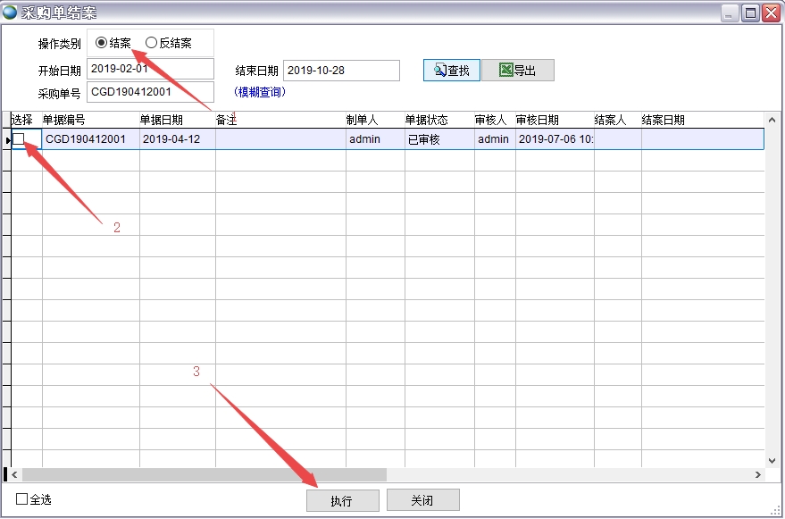 打開路徑:【主菜單】->【采購】-> 【采購單】->【采購單結(jié)案】