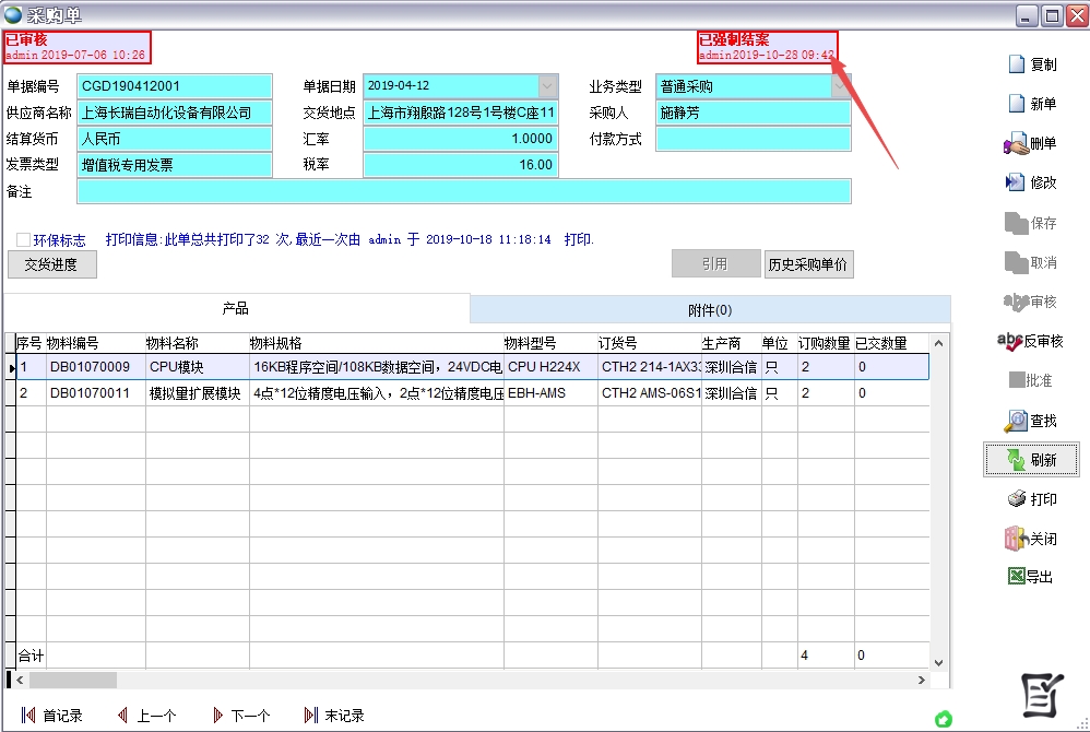 采購單結(jié)案是指將該采購單未完成部分作廢,即該采購單未完成部分不再需要采購,作廢后的采購單不能再被其他單據(jù)引用。