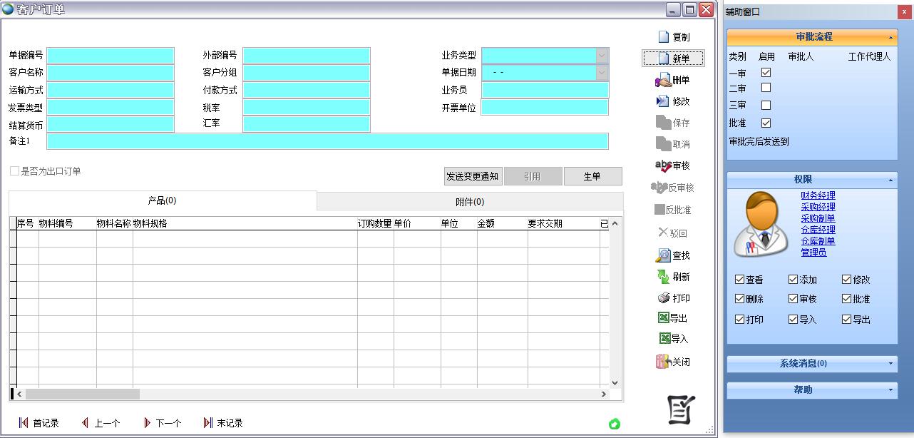 輔助窗口用來幫助用戶了解審批信息、系統消息的,比如用戶想知道采購單的是否需要審核、批準才能生效,該用戶對采購單有哪些權限,用戶可以打開工作流和角色權限表來了解,但是如果用戶沒有工作流、角色權限單據的打開權限就沒法了解審批信息和權限信息,這時可以點輔助窗口快速了解上述信息,輔助窗口打開不需要權限,任何用戶都可以打開。