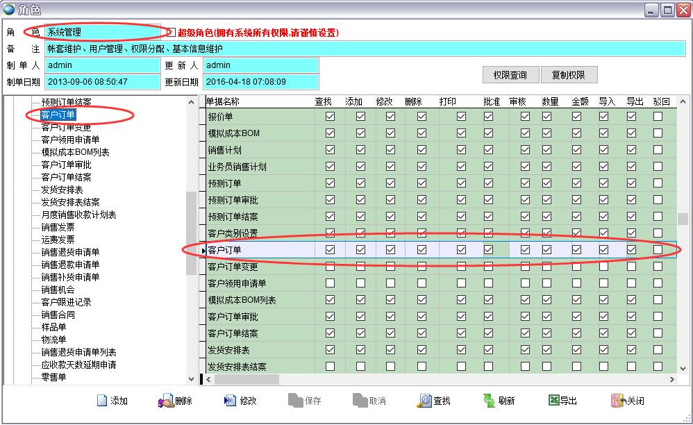 下圖紅色框顯示的是該用戶對客戶訂單擁有的權限,對應角色權限中的信息