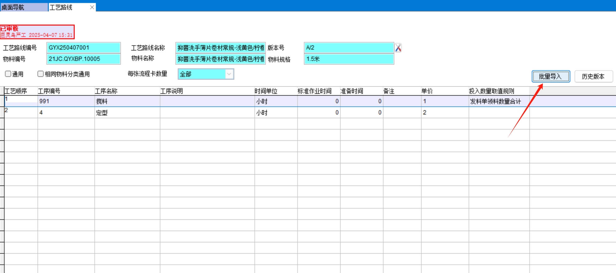 點反審核后版本號會自動加1,前一個版本會自動保存到歷史工藝路線
