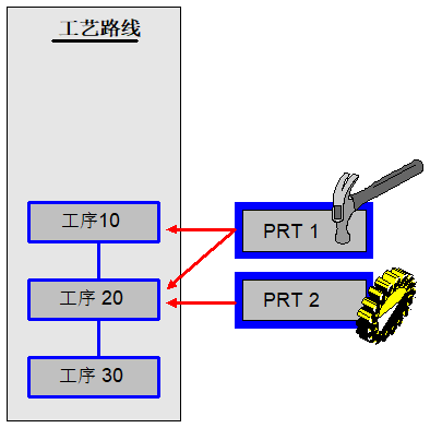 您把PRT分配給工藝路線中的工序。您既能把若干個PRT分配給一個工序,也能把同一個PRT分配給若干個工序(見圖)。