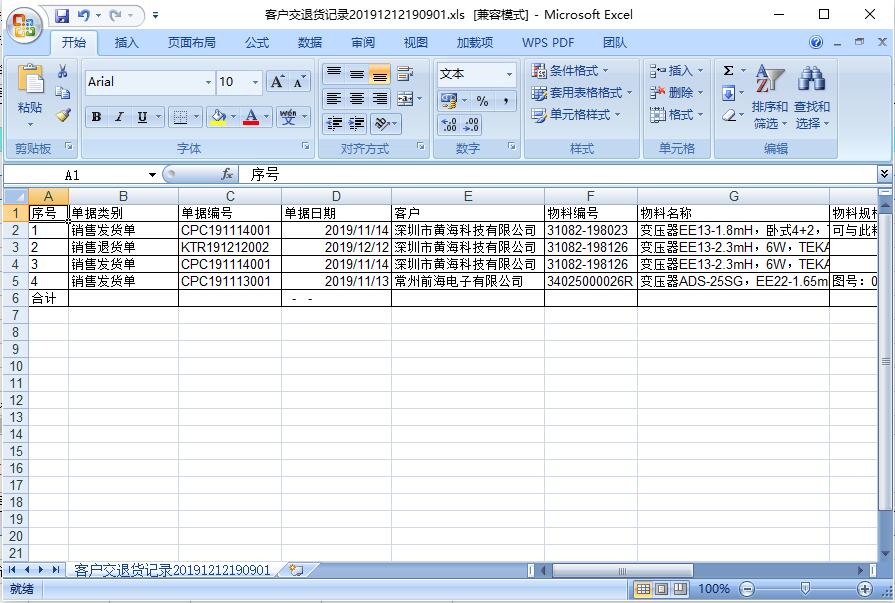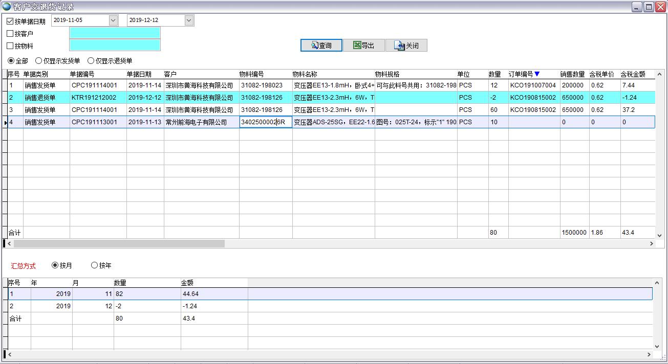 客戶交退貨記錄是統(tǒng)計(jì)一段時(shí)間內(nèi)銷售發(fā)貨單、銷售退貨單、銷售補(bǔ)貨單的統(tǒng)計(jì)表,包括訂單編號(hào)、發(fā)/退貨數(shù)量、產(chǎn)品編號(hào)、產(chǎn)品名稱、訂單單價(jià)、訂單金額等信息。