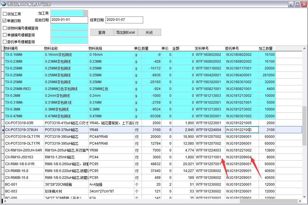 雙擊發料單號可以查看委托加工發料單,雙擊委托單號可以查看委托加工單明細