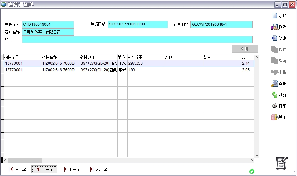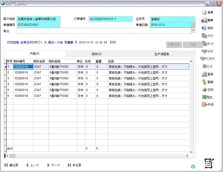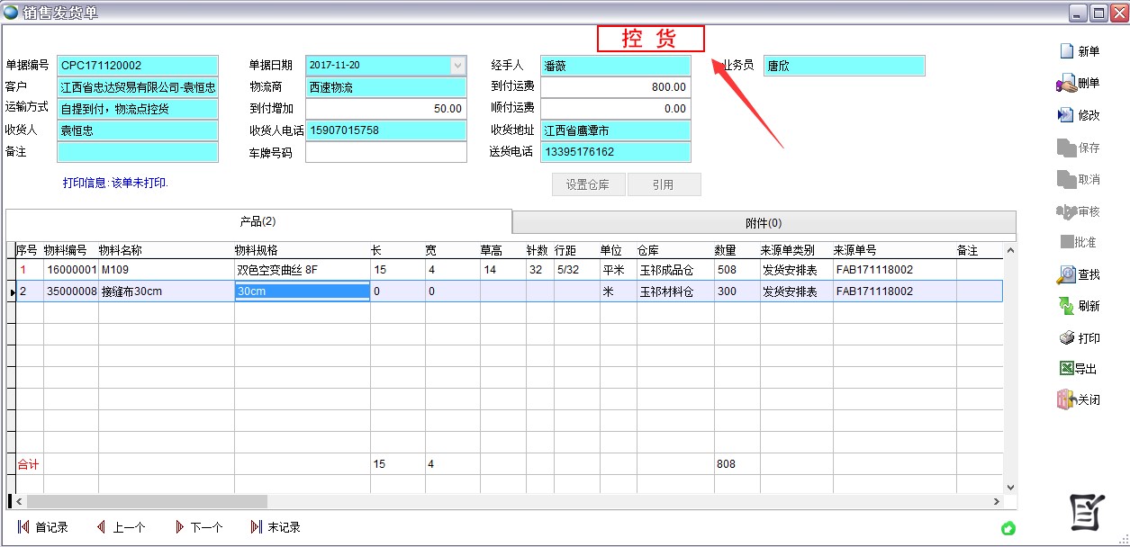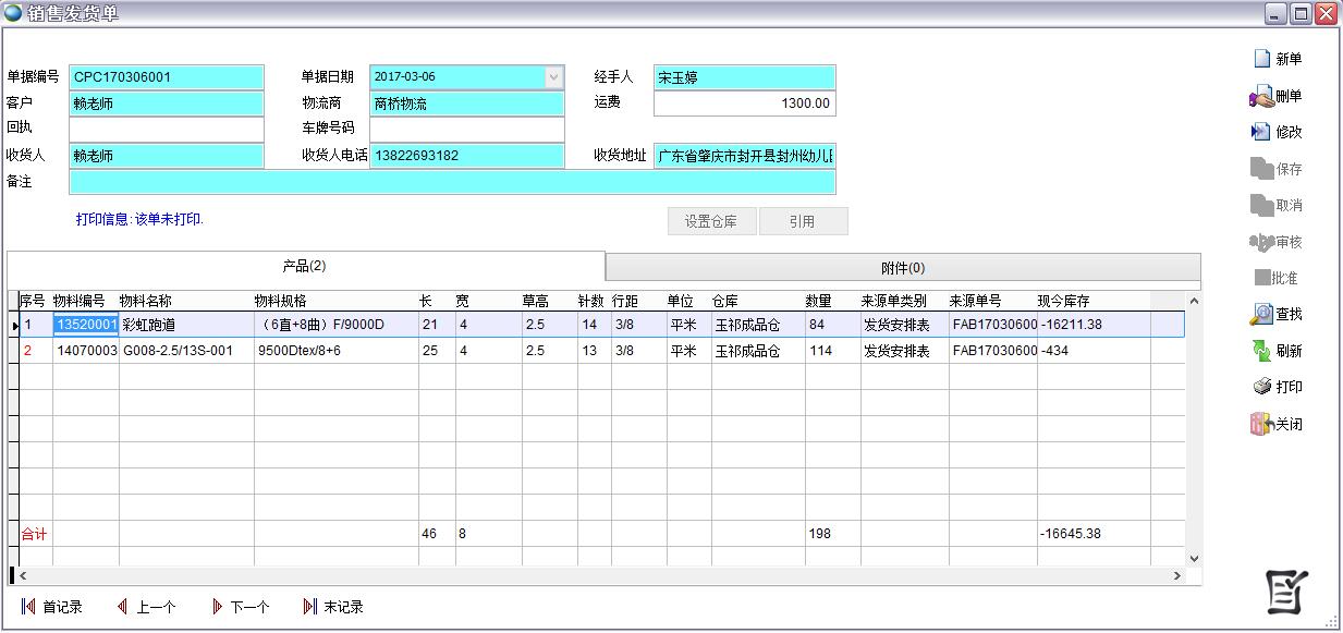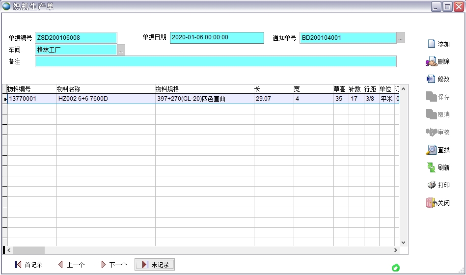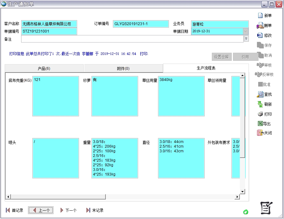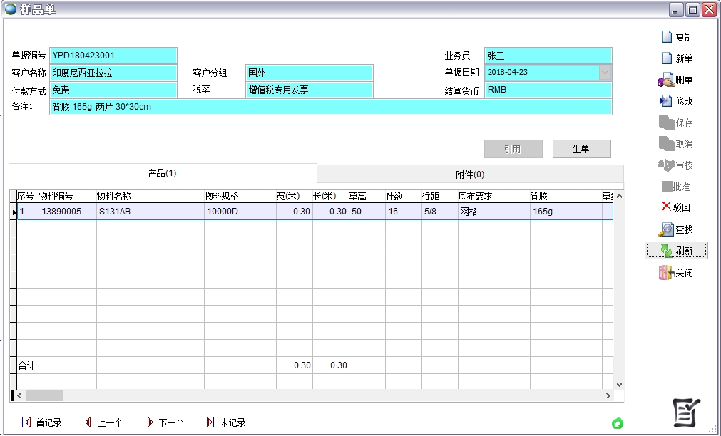 在客戶訂單、生產通知單、銷售發貨單中都要顯示長、寬、草高、針數、行距等參數