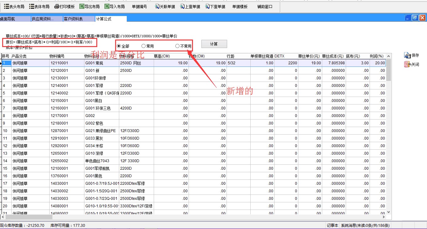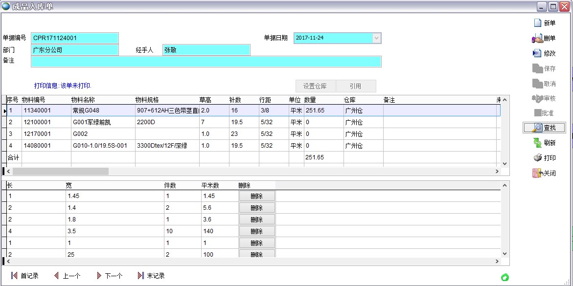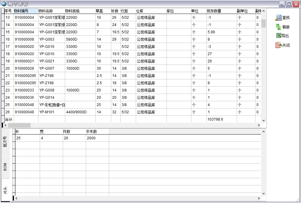 人造草坪的產品和主要原材料草絲的類別很多,而且具有特殊的屬性如長、寬、草高、針數、行距等,同一型號的產品如果草高、針數、行距不同則不能混放,因此對庫存管理要求較高,如果不通過軟件進行管理則效率很低也容易出錯。