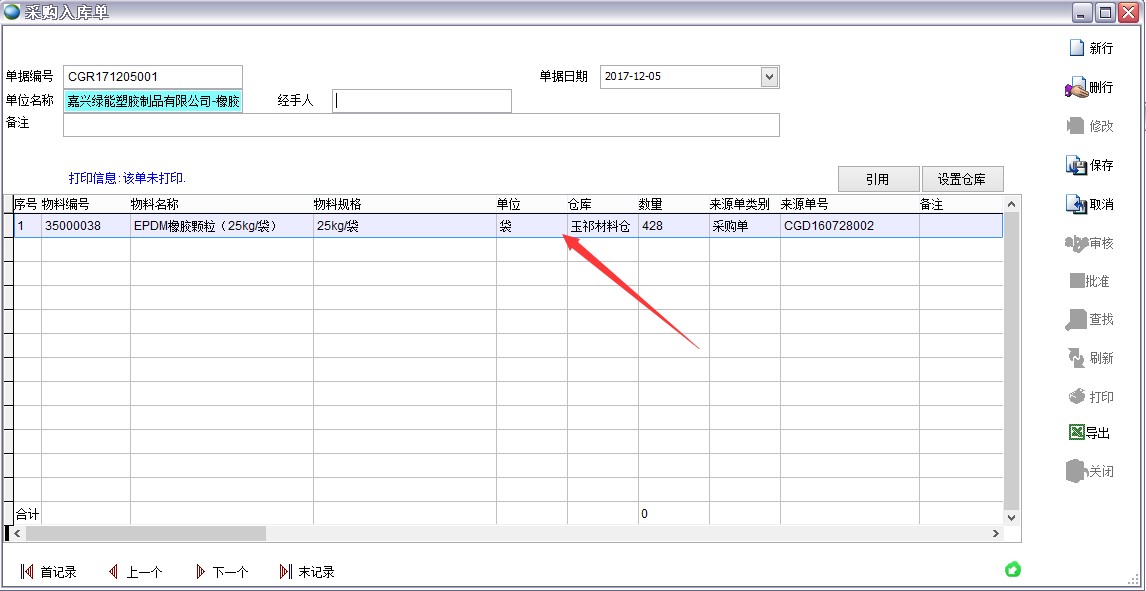 采購單需要使用雙計量單位,如下圖的橡膠顆粒,采購單上是kg,入庫單時自動換算成袋