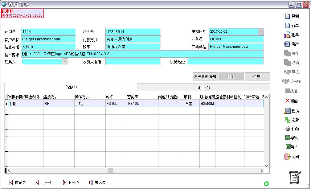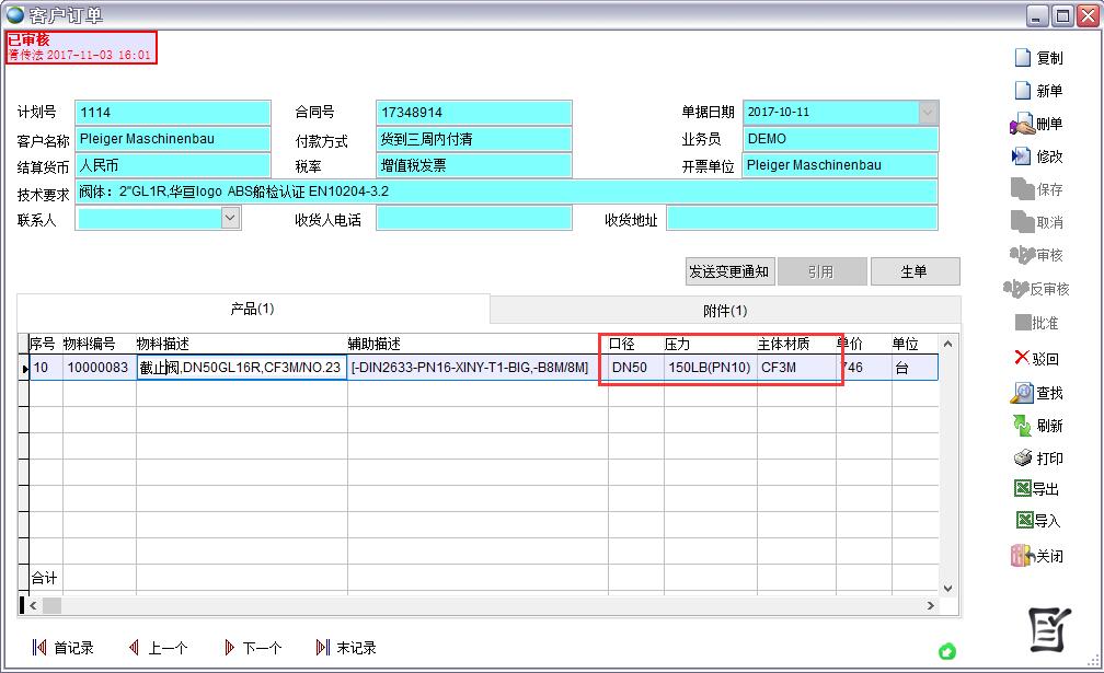 1、銷售訂單中對產品的描述項多達幾十項,除了物料描述、輔助描述來自物料編碼表外,其他如口徑、壓力、主體材質、連接方式、操作方式、閥桿、填料、密封方式等都手工填入或下拉框選擇。