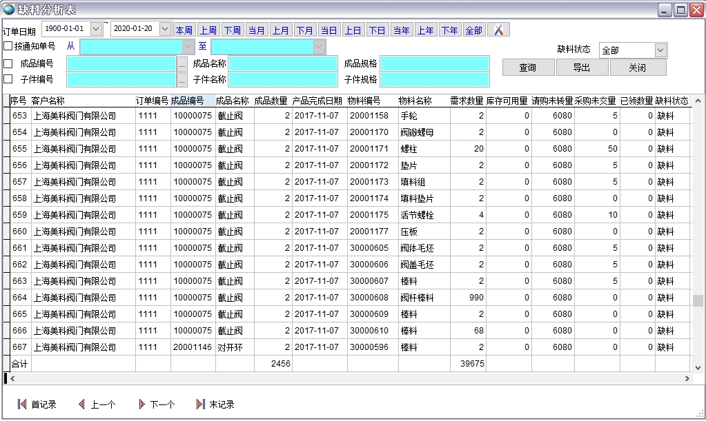 1、缺料分析表是自動產生的統計表,各部門可以對缺料情況進行實時跟蹤。