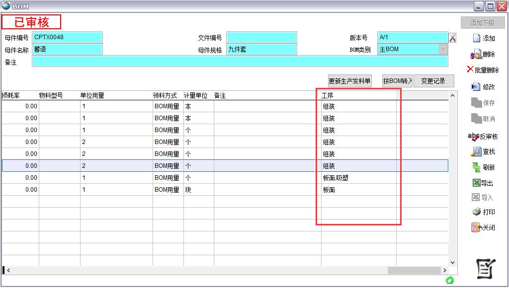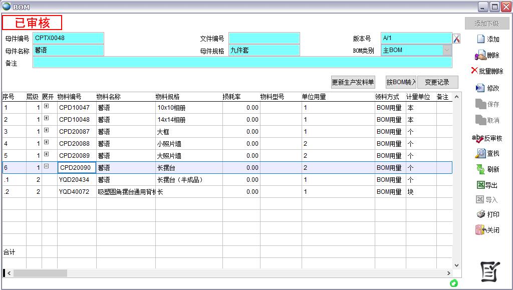 步驟三、每個產品建一個BOM表,BOM可以是多層的,比如成品由半成品組成,半成品由子件組成,則BOM就是3層結構