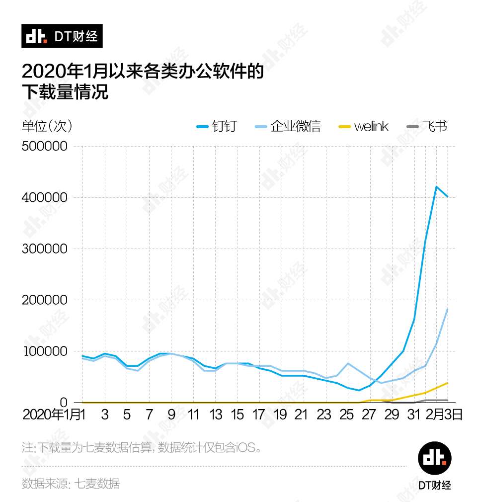 下圖是財經雜志做的主流遠程辦公軟件下載統計,可以看到1月底日下載量明顯提升。