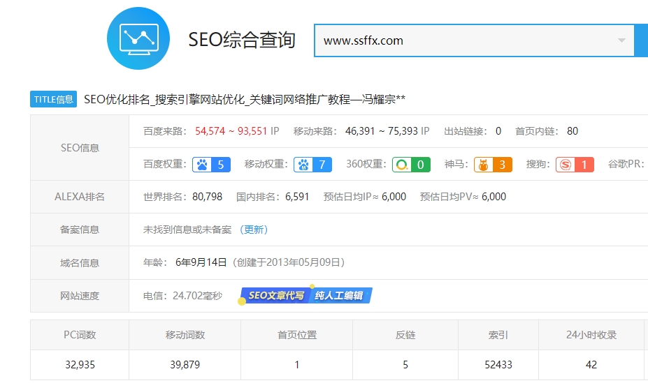 先給大家看一個(gè)案例,www.ssffx.com,這個(gè)網(wǎng)站名稱叫馮耀宗博客,用站長工具分析這個(gè)網(wǎng)站的權(quán)重和流量都很高,百度收錄是7萬,百度權(quán)重5,百度預(yù)估流量6萬。