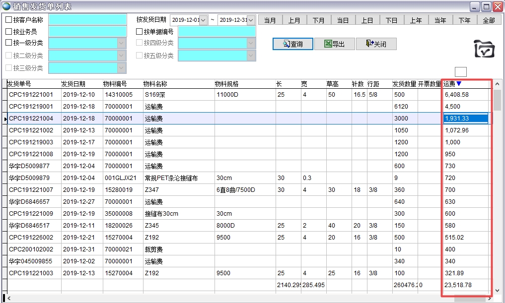 12月銷售發貨運費的統計