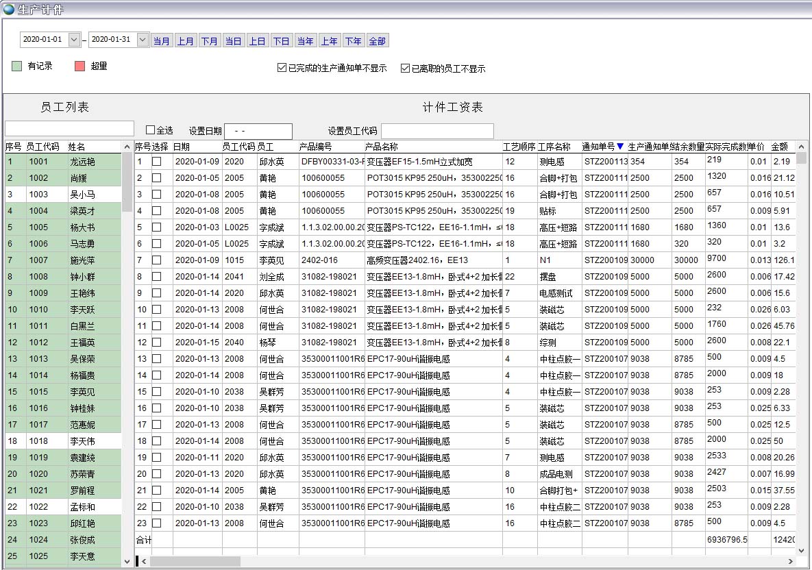 1月份車間員工生產計件工資
