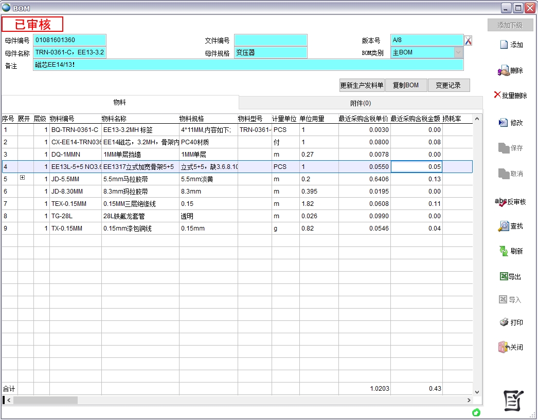 通過BOM設置材料標準采購成本