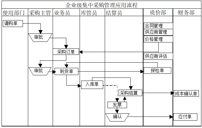 企業(yè)級(jí)集中采購管理模式指在企業(yè)級(jí)采購管理應(yīng)用中,各部門所需物料統(tǒng)一由采購部門進(jìn)行集中采購,尤其對(duì)公用的物料采購,如辦公用品、辦公設(shè)備、消耗性材料、勞務(wù),及重要物料,可以由各用料部門提出采購申請(qǐng),由專門的采購部門進(jìn)行采購,另外基于“不相容權(quán)利應(yīng)分開設(shè)置”的原則,將定價(jià)權(quán)、采購權(quán)、質(zhì)檢權(quán)及支付權(quán)做必要的分離,如對(duì)供應(yīng)商選擇、采購價(jià)格、質(zhì)量檢驗(yàn)、采購合同簽定等可設(shè)置專門的質(zhì)價(jià)部進(jìn)行管理。