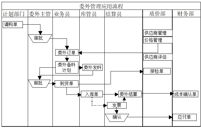 生產(chǎn)計(jì)劃系統(tǒng)生成的委外計(jì)劃訂單及車間訂單系統(tǒng)產(chǎn)生的臨時(shí)委外訂單經(jīng)過確認(rèn)生成委外請(qǐng)購單,委外管理系統(tǒng)接受請(qǐng)購單生成委外訂單,同時(shí)生成委外備料計(jì)劃,委外訂單發(fā)往委外廠家,同時(shí)按照委外備料計(jì)劃給委外廠家發(fā)料或定期批量發(fā)料;委外生產(chǎn)成品入廠后物流過程類似采購;委外結(jié)算過程除結(jié)算委外費(fèi)用外,還要考慮委外扣料(對(duì)于長期委外廠家定期發(fā)料)的委外耗料的內(nèi)部成本結(jié)算。