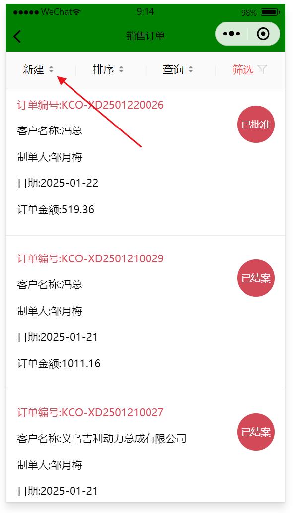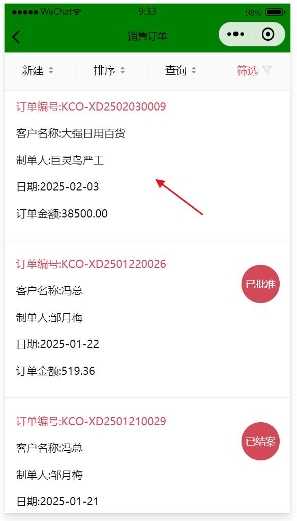 銷售訂單在微信小程序中可以查看、審批、新建,銷售訂單如果是在ERP中建立的,數據會實時同步到小程序中