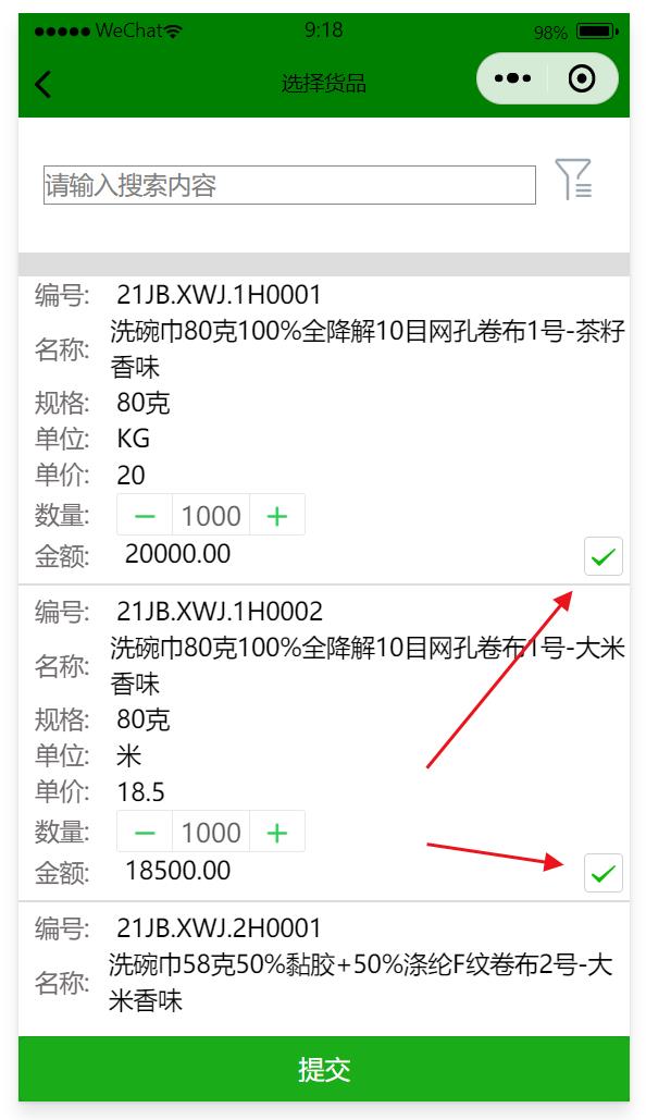 3、選擇貨品,可以按條件篩選貨品,輸入單價、數量后點擊選擇框,點提交