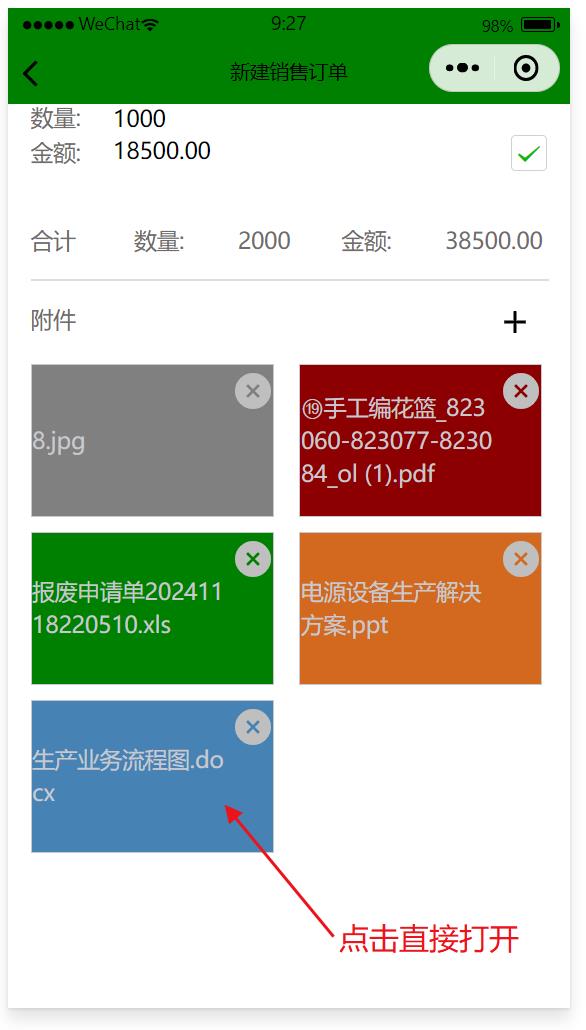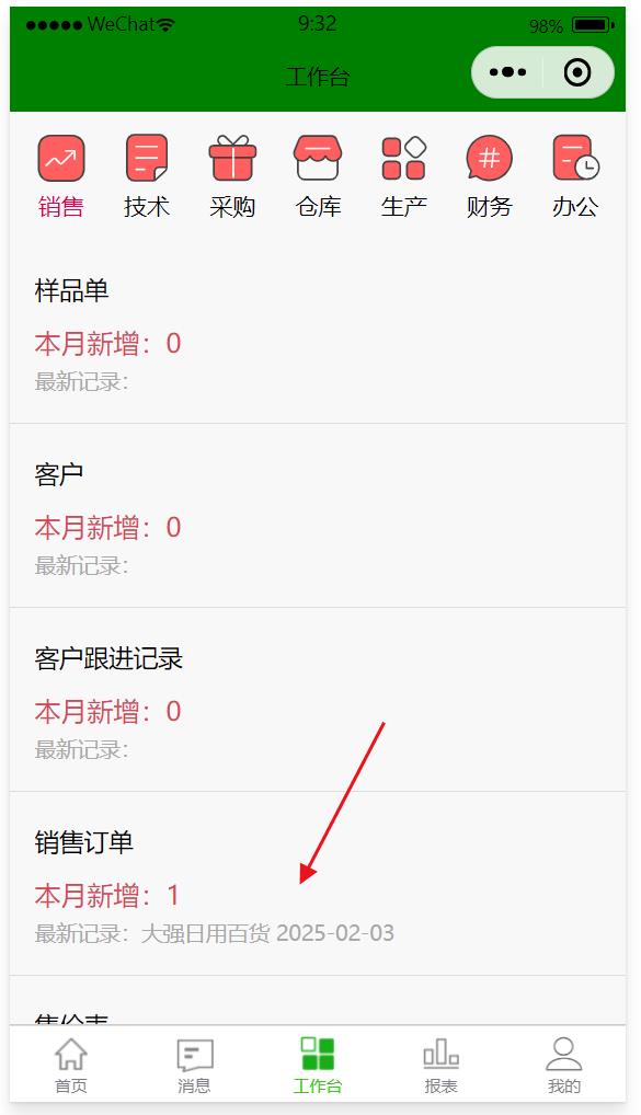 反審批 審批后的單據不會出現在待審批記錄中,可以在工作臺中找到該訂單進行反審批 點反審核即可 產品圖片 產品圖片可以從手機端的商品表中直接上傳,也可以從PC端的物料編碼表中上傳,圖片會自動同步到手機端 新建 可以通過微信小程序直接做銷售訂單 使用手機做銷售訂單可以實現出差在外或異地辦公的人員也能直接下銷售訂單,數據會實時同步到PC端,PC端人員在ERP系中繼續完成該訂單的后續業務。 1、點新建 相關知識