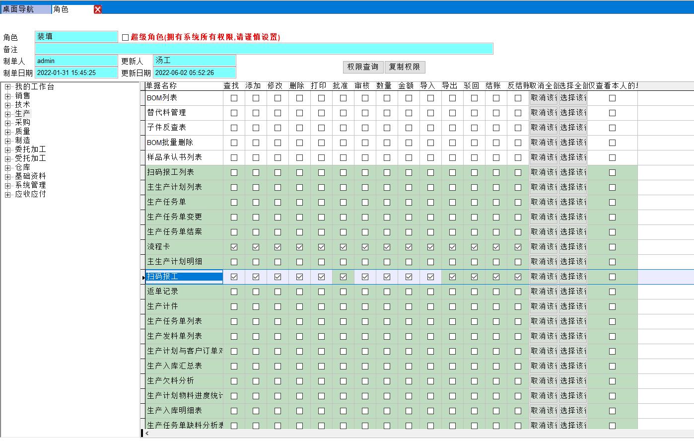 每個工序建立一個角色,角色的作用是用于分配權限,生產人員只要分配掃碼報工的權限即可