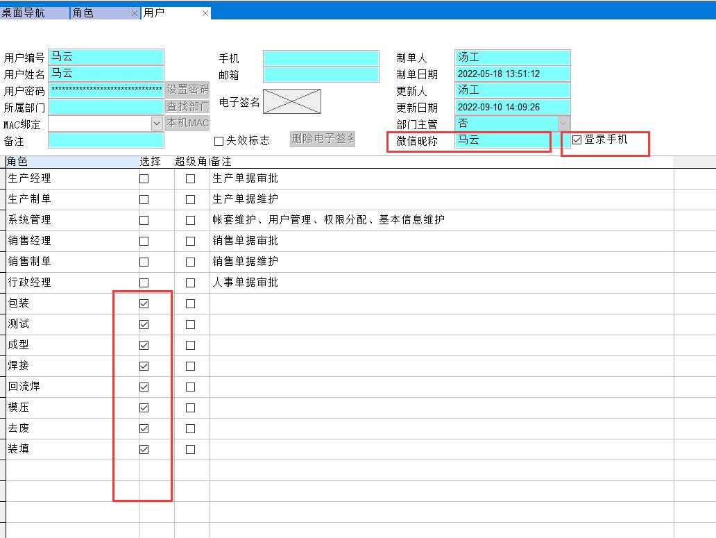 為了演示我僅建立了一個用戶馬云,為馬云綁定了所有角色。實際使用應該是一個用戶綁定一個角色(即一個工序,當然也可以多個工序),即我用馬云賬號完成所有工序掃碼報工。