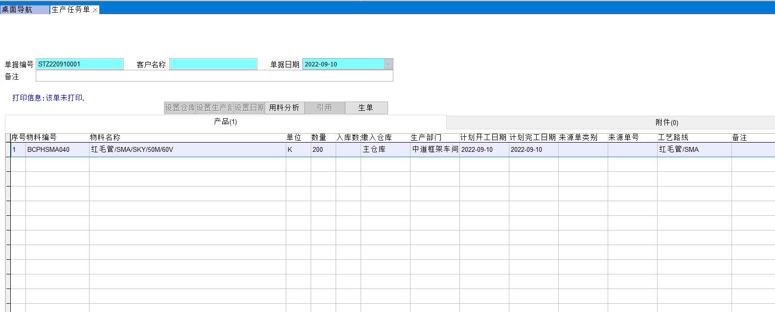 生產(chǎn)半成品紅毛管200k,當(dāng)選中產(chǎn)品后會(huì)自動(dòng)綁定該產(chǎn)品對(duì)應(yīng)的工藝路線