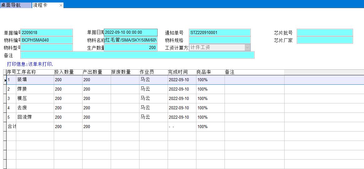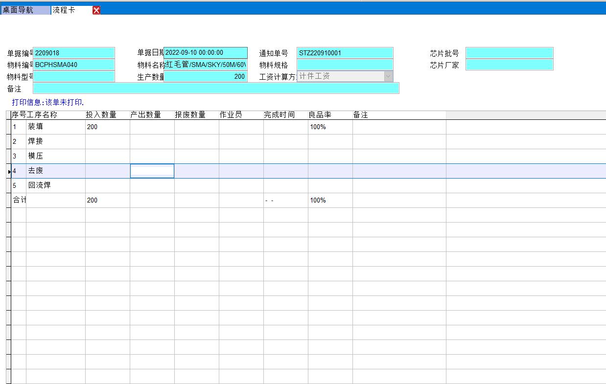 進(jìn)入工作臺(tái)-生產(chǎn)-流程卡,剛才在ERP中建立的流程卡就會(huì)出現(xiàn)在最頂端