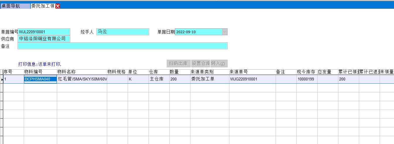 提交后生成委托加工單,注意,在外發(fā)前領(lǐng)料的是紅毛管,委外單已經(jīng)自動變成了白毛管