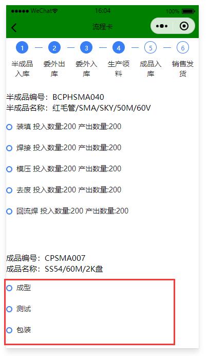 分別用成型、測試、包裝的工序名稱登錄進(jìn)行掃碼報(bào)工