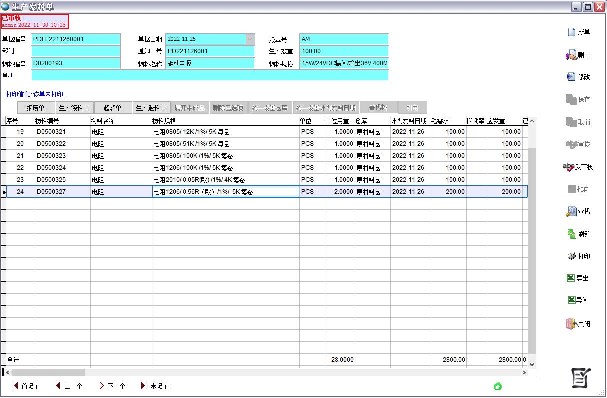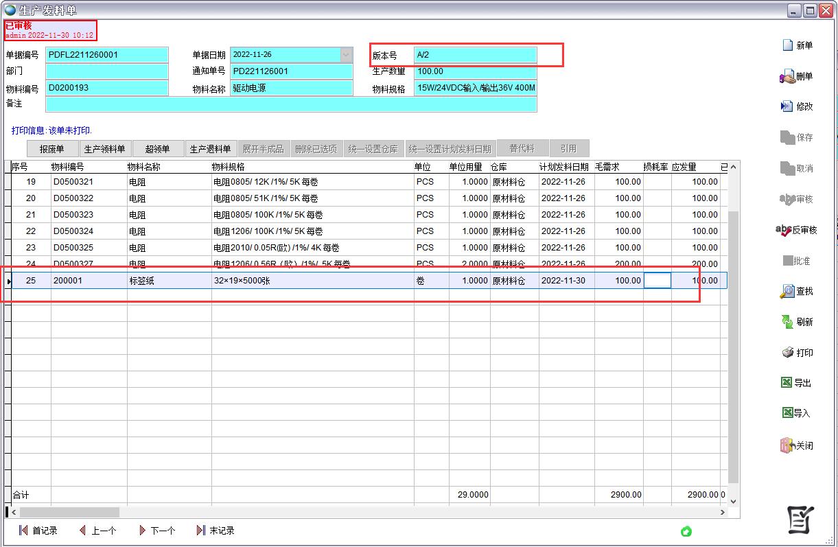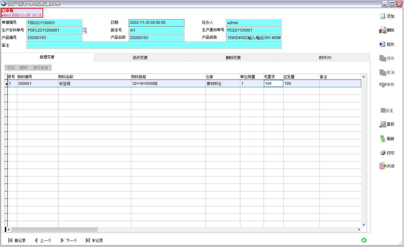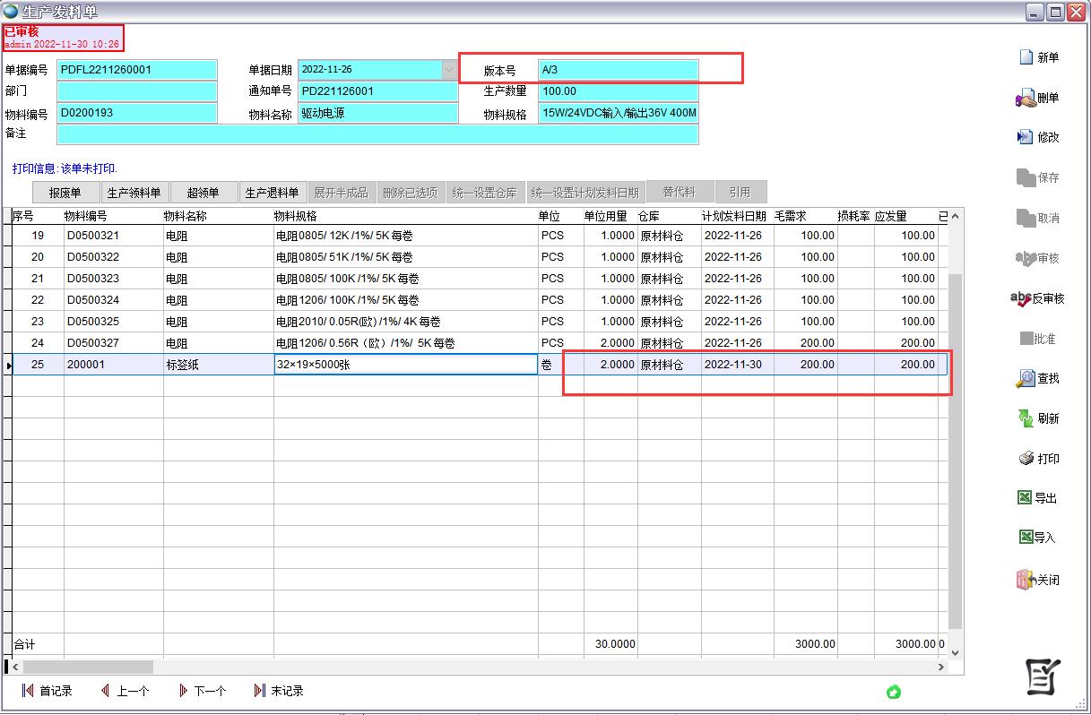 3、變更后的生產發料單,版本號自動變為A2 修改變更 1、變更前的生產發料單,版本是A2版 2、新建生產發料單變更通知單 還是這個物料,數量100改為200 3、變更后的生產發料單,版本自動變為A3版 刪除變更 1、變更前的生產發料單 2、新建變更單 3、變更后的生產發料單 打印 發料單變更后可以把變更單打印下發倉庫,打印格式用戶可以自行修改 相關知識 生產發料單