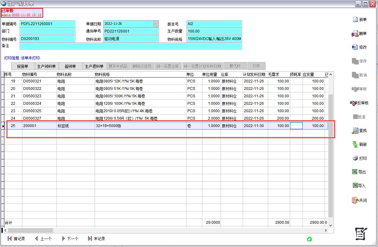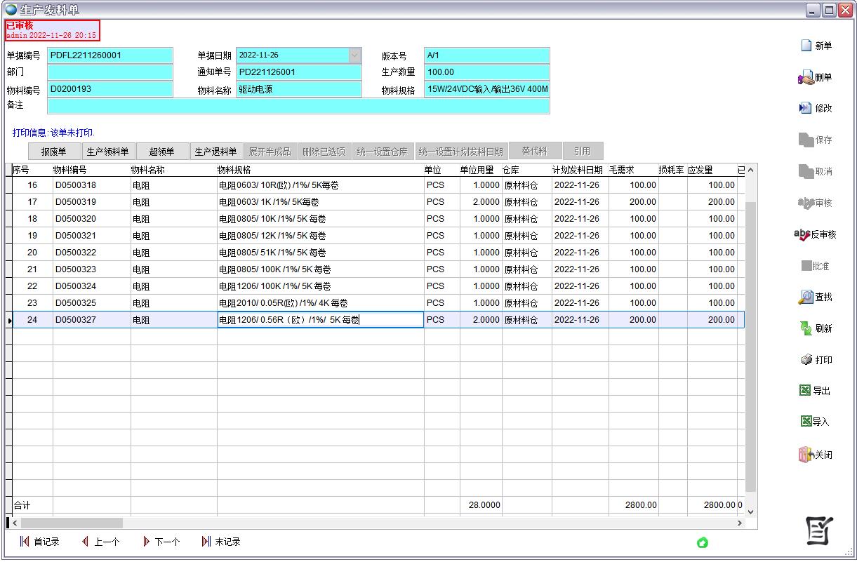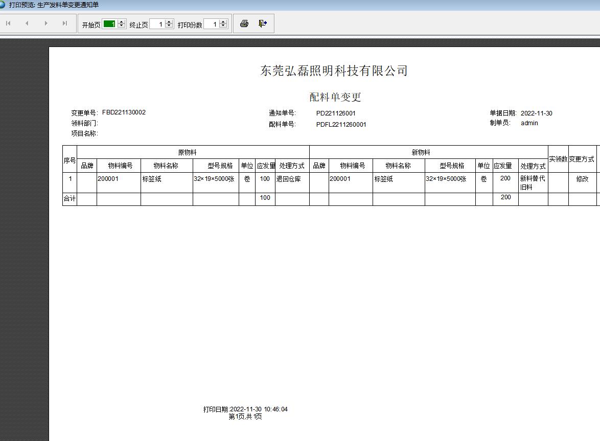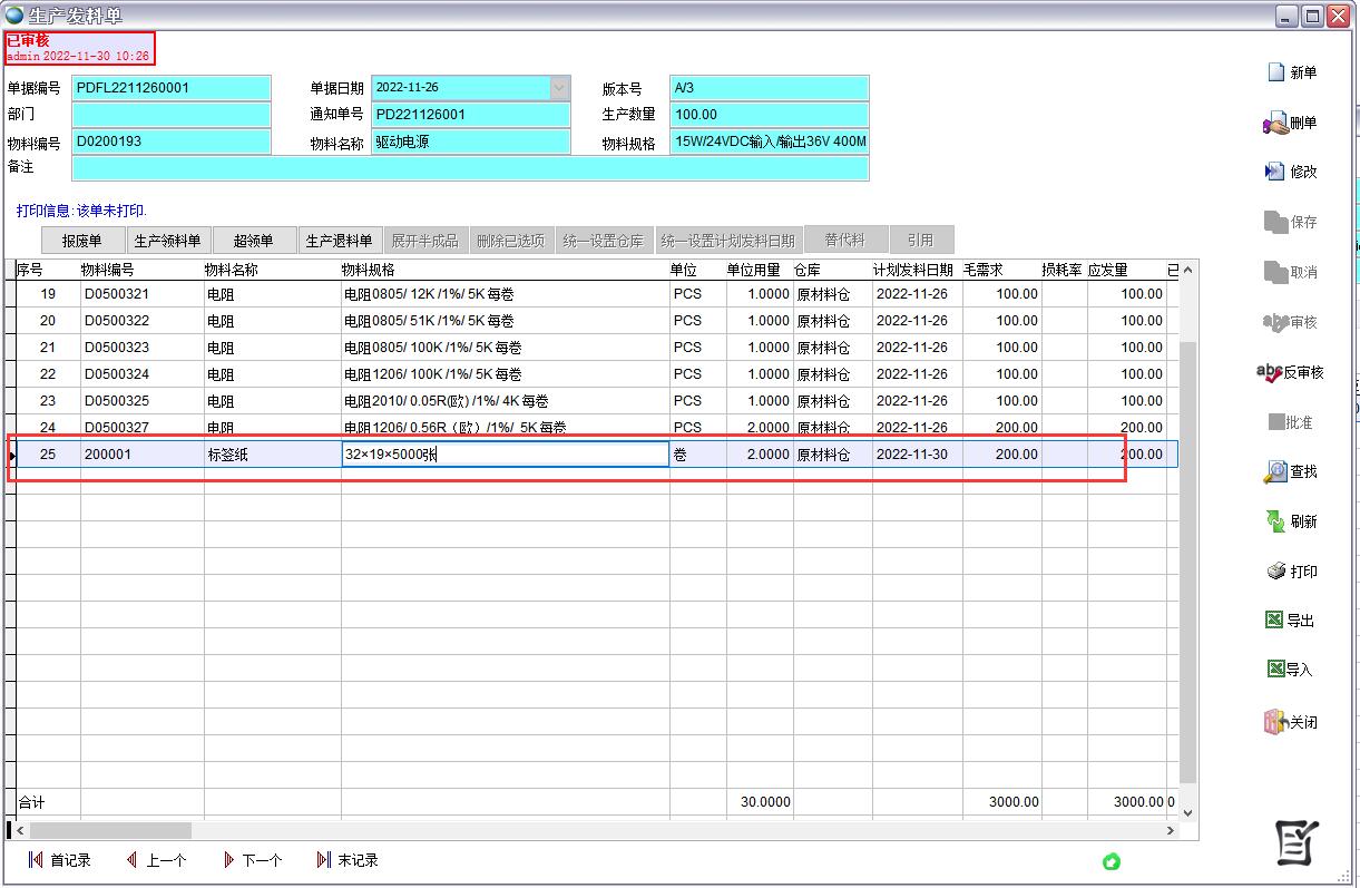 3、變更后的生產發料單,版本號自動變為A2 修改變更 1、變更前的生產發料單,版本是A2版 2、新建生產發料單變更通知單 還是這個物料,數量100改為200 3、變更后的生產發料單,版本自動變為A3版 刪除變更 1、變更前的生產發料單 2、新建變更單 3、變更后的生產發料單 打印 發料單變更后可以把變更單打印下發倉庫,打印格式用戶可以自行修改 相關知識 生產發料單