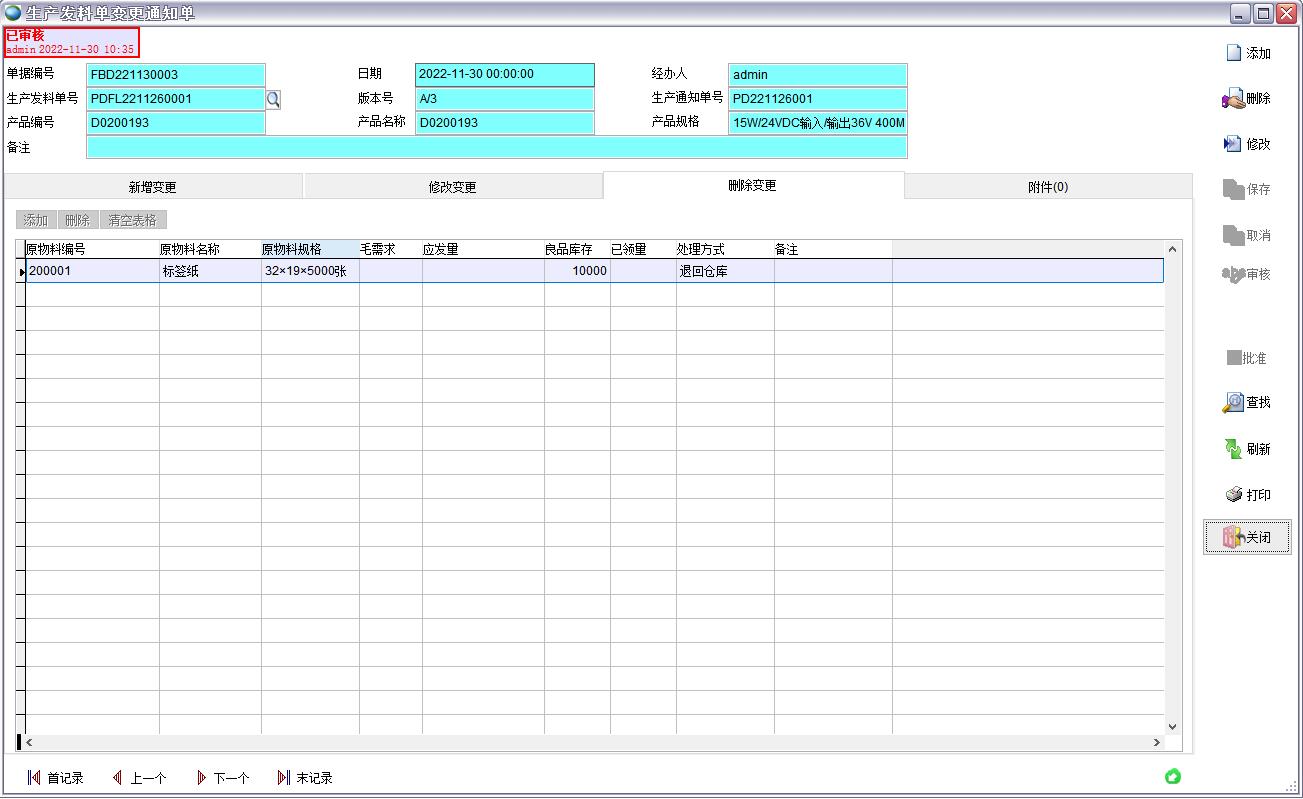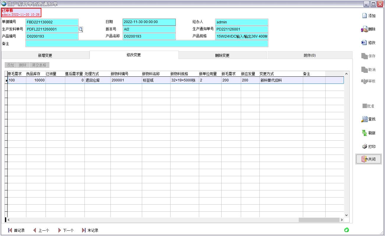 這個變更單如果沒有設置工作流的話保存就生效,即可以同步更新生產發料單,起到修改生產發料單的作用。