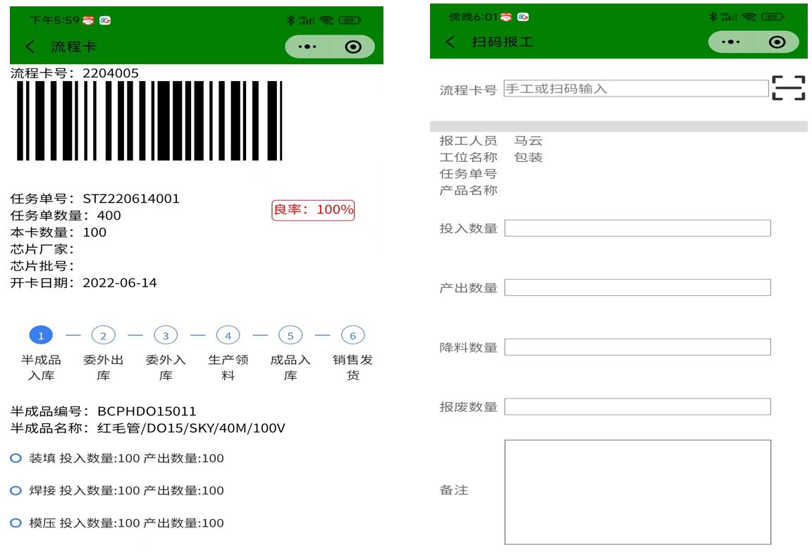 右邊圖是掃流程卡完成工序報工,左邊圖是掃碼后的結(jié)果