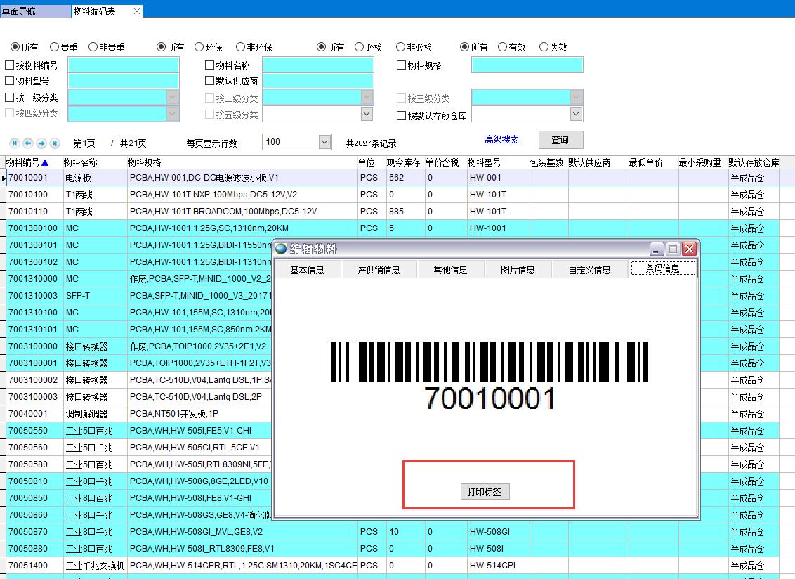 物料編碼表中新建的物料都會自動生成產品條碼,產品條碼就是物料編號,可以直接瀏覽產品標簽并打印標簽
