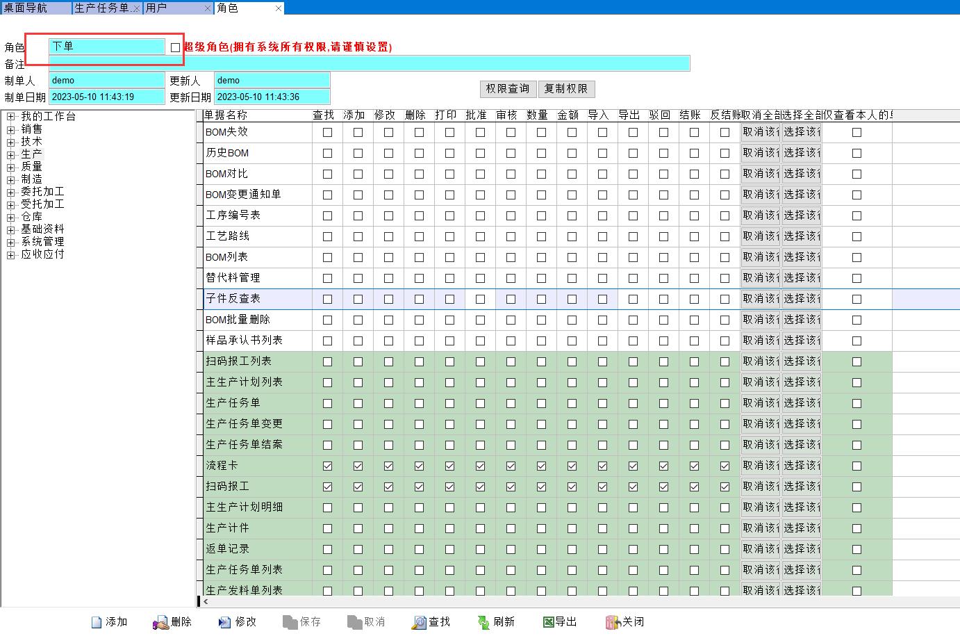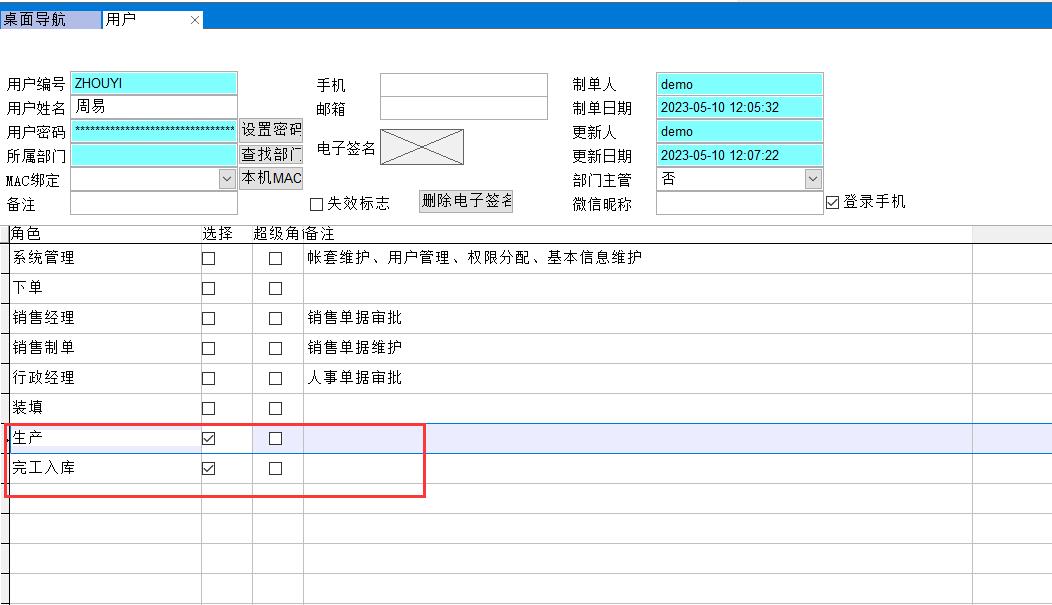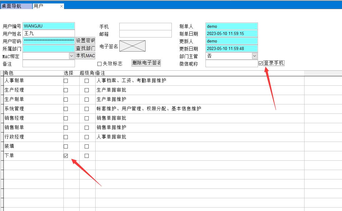 先設置角色,角色就是工序或者崗位,比如新建員工王九,他負責業務下單
