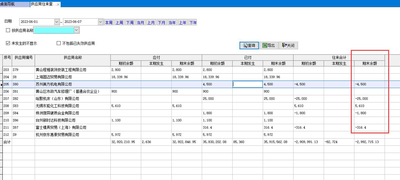 往來合計的期末余額就是我方欠供應(yīng)商的金額,負(fù)數(shù)表示對方欠我方的,即預(yù)付款