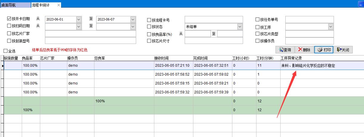 記錄異常后在流程卡統計中可以看到異常記錄