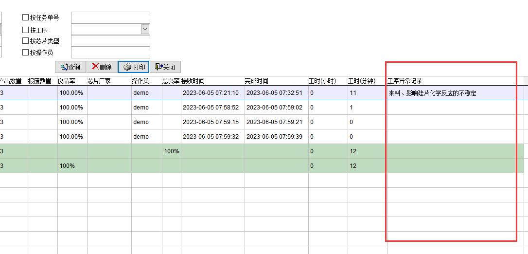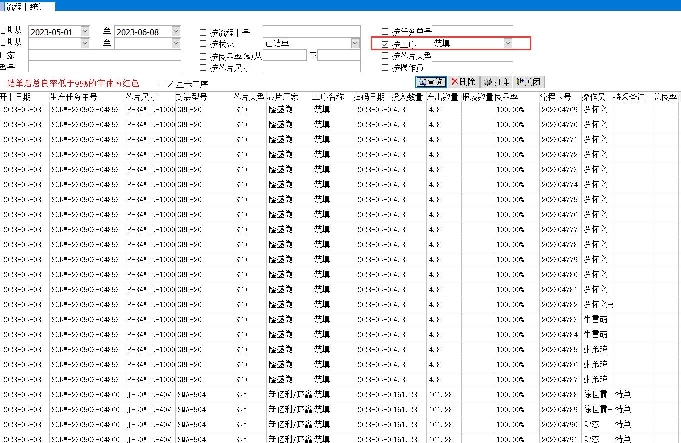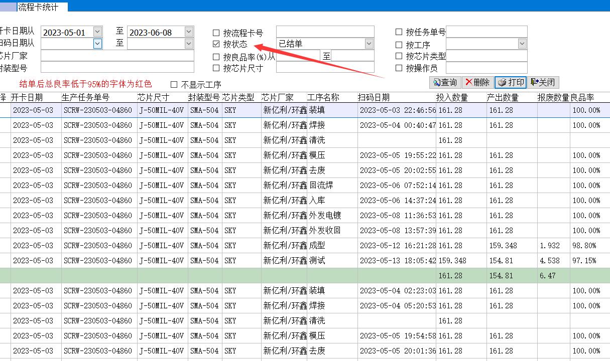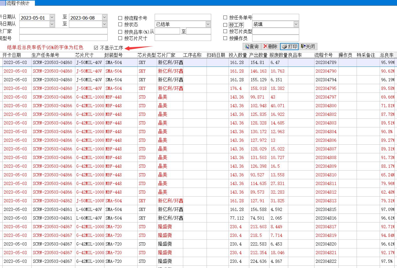默認情況下會顯示所有工序的完成情況,如果勾選不顯示工序,每張流程卡只會顯示一條記錄,即該流程卡總的投入和產(chǎn)出數(shù)量,總的良品率