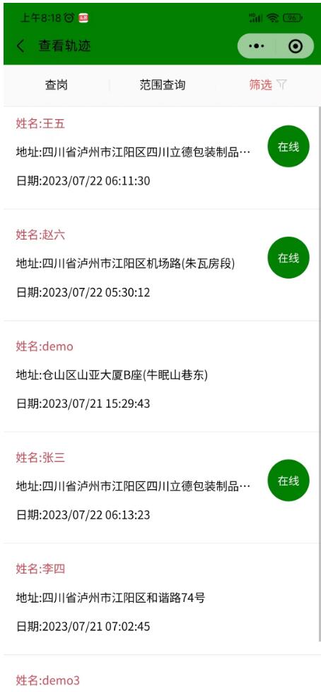 需求概述 對在外人員的管理,是很多企業(yè)的管理盲區(qū): 1、某一個(gè)突發(fā)事件需要最近的在外人員趕去處理,但是因?yàn)闊o法知道所有人員現(xiàn)在的位置錯(cuò)過了處理問題的最佳時(shí)機(jī)。 2、人員有沒有去達(dá)工作現(xiàn)場 3、貨車司機(jī)、快遞小哥的行程軌跡追蹤 4、危化品、貴重物品的運(yùn)輸軌跡追蹤 在很多應(yīng)用場景中,企業(yè)需要能通過手機(jī)對在外人員、車輛、物品的行程軌跡進(jìn)行追蹤。通過巨靈鳥微信小程序可以簡單高效的解決這個(gè)問題。 員工視角 1、打卡簽到 員工打卡后開始啟動地理位置共享,每隔一分鐘記錄一次地理位置信息。巨靈鳥小程序使用低功耗取點(diǎn)技術(shù),能有效節(jié)省手機(jī)耗電量 下班打卡后停止共享 打卡后下面這個(gè)標(biāo)識標(biāo)識正在共享地理位置信息 2、工作線路 員工可以查看本人的行程軌跡 主管視角 1、查看軌跡 可以查看所有員工任何一天的行程軌跡,包括在線時(shí)長、行程公里數(shù) 可以直接定位到任意一點(diǎn) 2、實(shí)時(shí)查崗 總結(jié):沒有多余的功能,用戶上手就能使用 相關(guān)知識