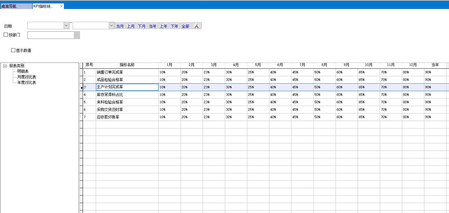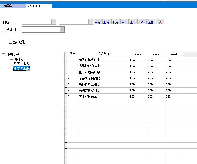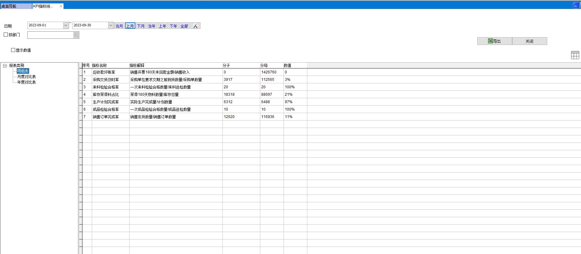 大多數企業實施ERP系統存在重建設、輕評估的問題。對ERP系統實施的效果多是定性評價,比如實現了信息共享、順利上線使用等。 本文介紹在ERP系統中設置KPI指標對ERP系統的實施效果進行定量分析,并能夠按月進行統計以便持續改進KIP指標。