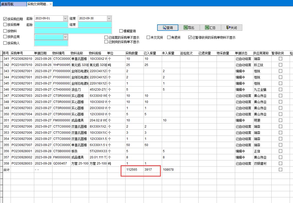 數據來源在系統中都能夠查詢到,比如采上圖的9月份采購交貨及時率,分子:9月份入庫3917,分母:9月份采購單數量112565,在采購交貨明細表中可以查詢到分子分母數據