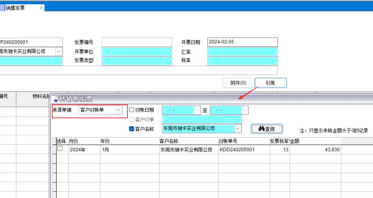 3、引用對(duì)帳單開(kāi)銷(xiāo)售發(fā)票