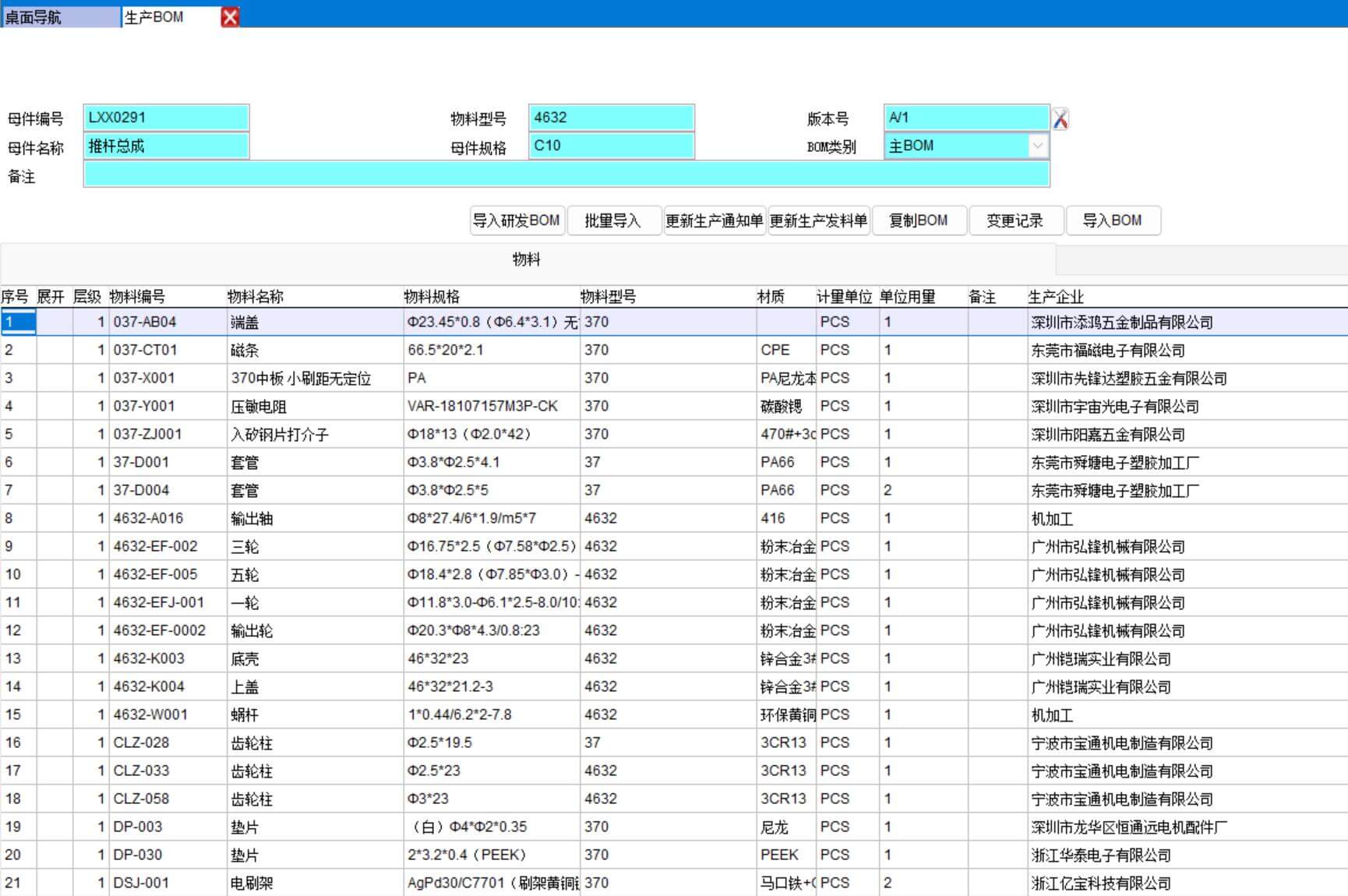 在ERP中,物料一詞有著廣泛的含義,它是所有產(chǎn)品,半成品,在制品,原材料,配套件,協(xié)作件,易耗品等等與生產(chǎn)有關的物料的統(tǒng)稱。BOM是指由雙親件及子件所組成的關系樹。BOM可以是自頂向下分解的形式或是以自底向上跟蹤的形式提供信息。在ERP系統(tǒng)中中BOM是一種數(shù)據(jù)之間的組織關系,利用這些數(shù)據(jù)之間層次關系可以作為很多功能模塊設計的基礎,這些數(shù)據(jù)的某些表現(xiàn)形式是我們大家感到熟悉的匯總報表。BOM有什么作用?BOM是ERP最重要的基礎數(shù)據(jù),其組織格式設計和合理與否直接影響到系統(tǒng)的處理性能,因此,根據(jù)實際的使用環(huán)境,靈活地設計合理且有效的BOM是十分重要的。BOM不僅是重要的輸入數(shù)據(jù),而且是財務部門核算成本,制造部門組織生產(chǎn)等的重要依據(jù),因此,BOM的影響面最大,對它的準確性要求也最高。正確地使用與維護BOM是管理系統(tǒng)運行期間十分重要的工作。